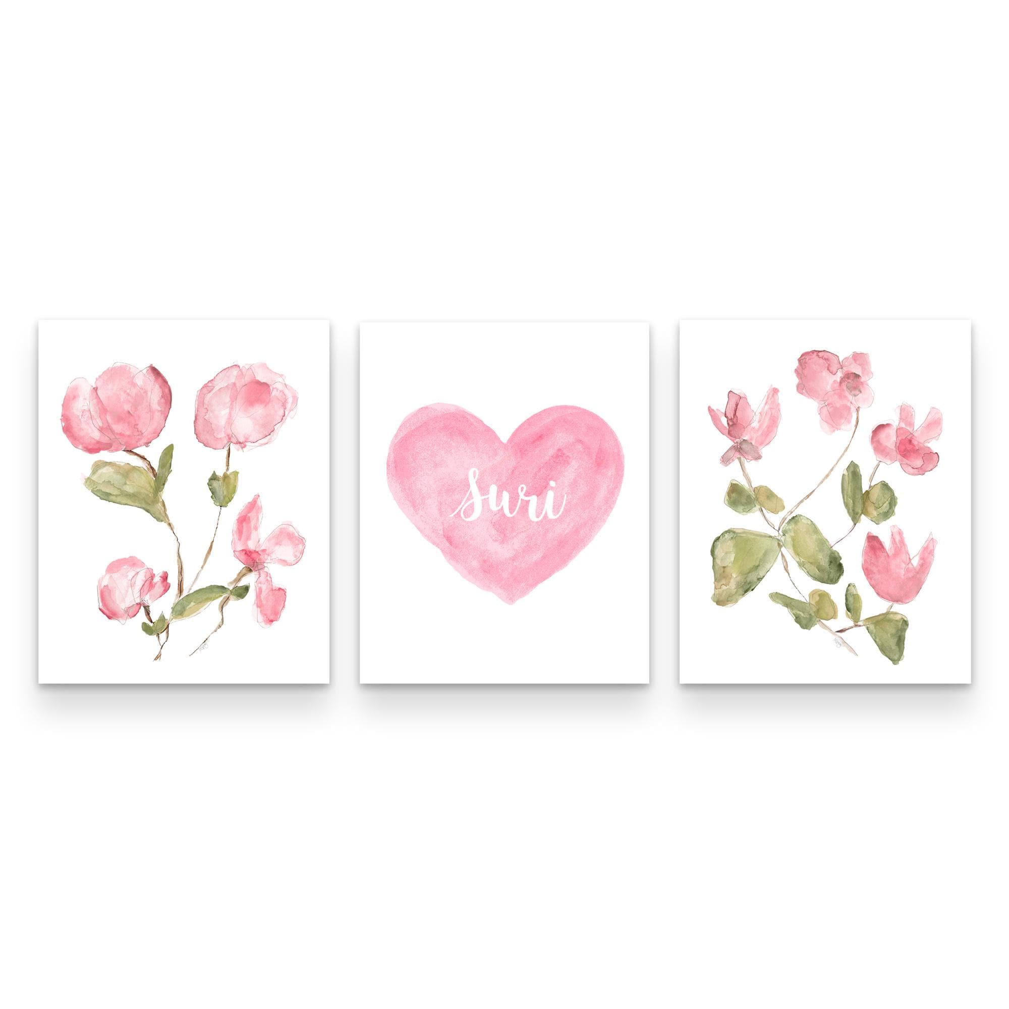 A pair of romantic soft rose pink floral sprigs center a personalized heart.