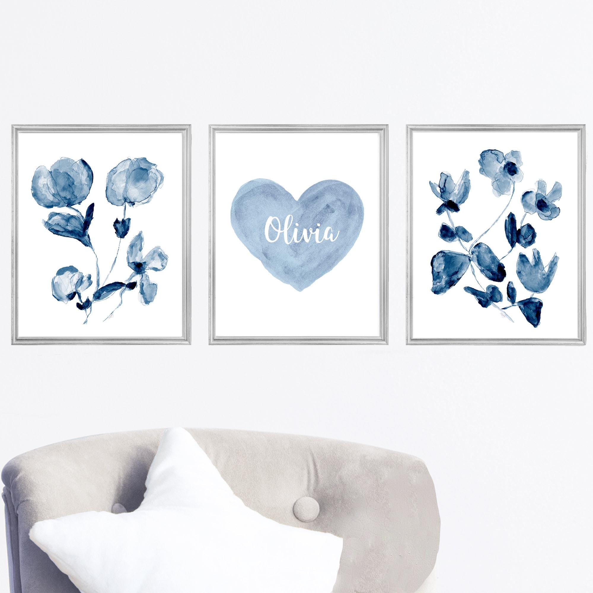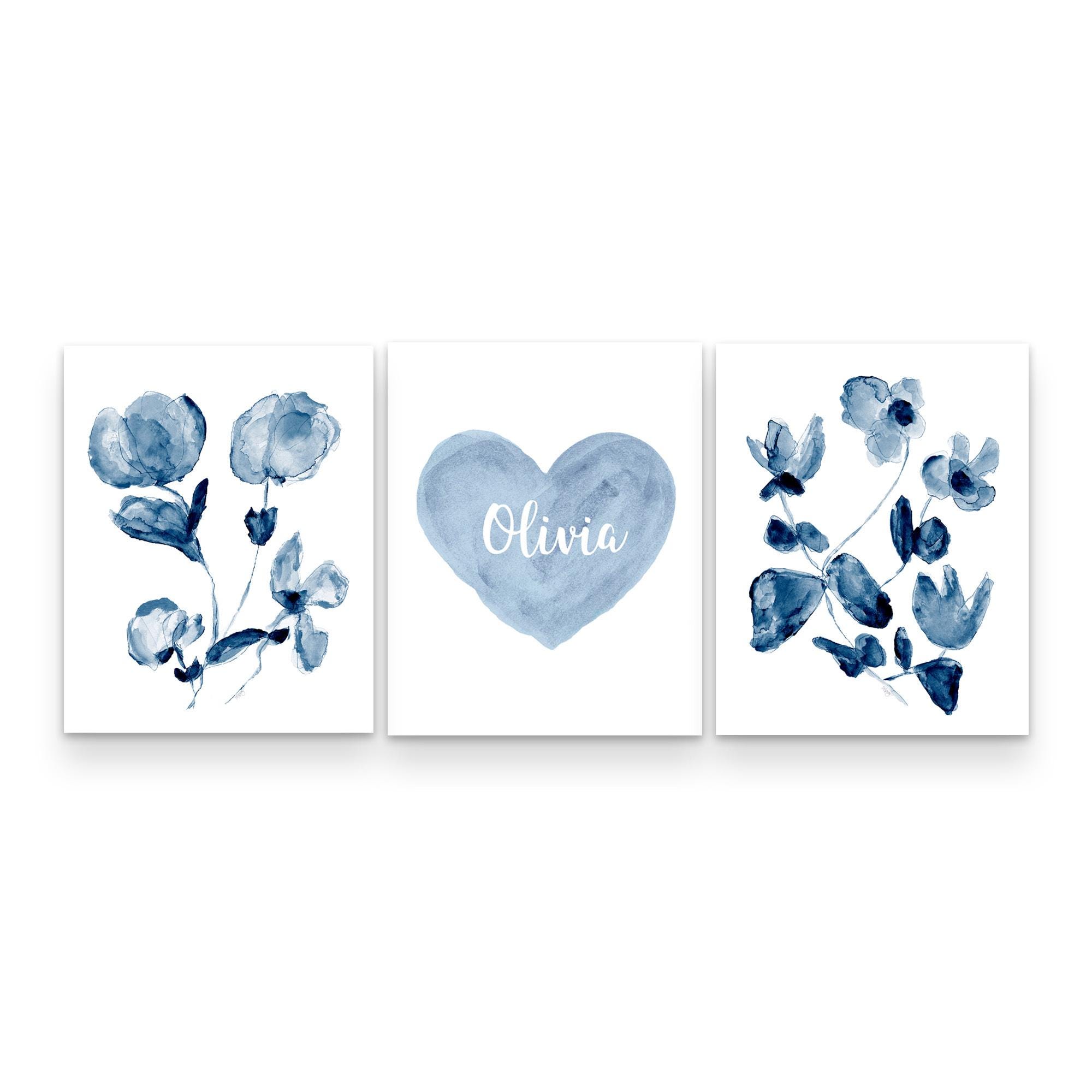 A pair of inky blue florals center a personalized denim blue heart. Recreated as prints from my original paintings. Perfect for a variety of ages.