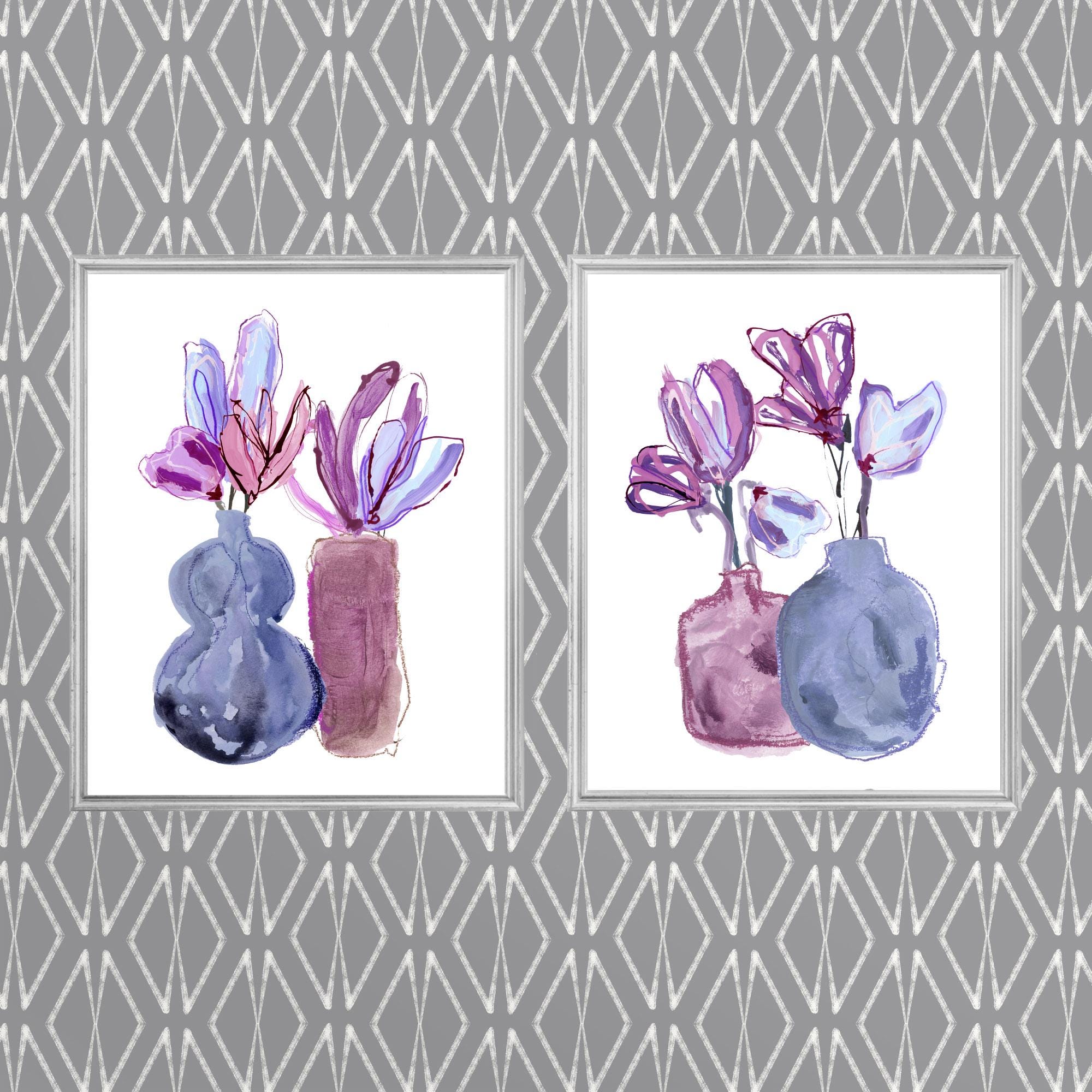 A creative floral unframed art print set is made up of a two colorful purple, plum, lavender and light blue flower sprigs in a selection of plum and purple vases. Recreated as prints from my original paintings. Two colors available.