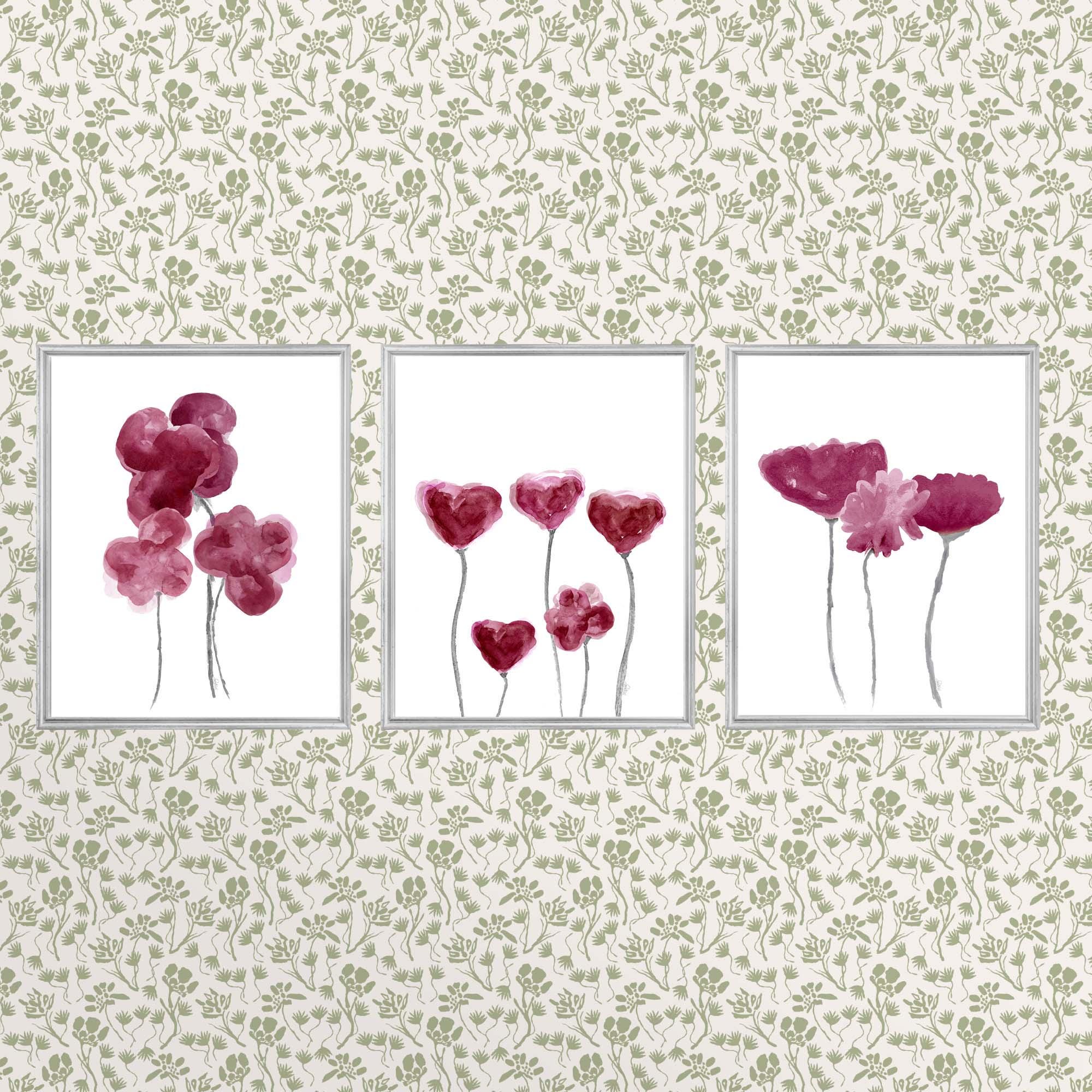 A delicate set of three pretty coordinating flowers happily hanging together. Available in Dusty Rose with light gray stems, or deep wine with dark gray stems. Each print is recreated from my original watercolor paintings.