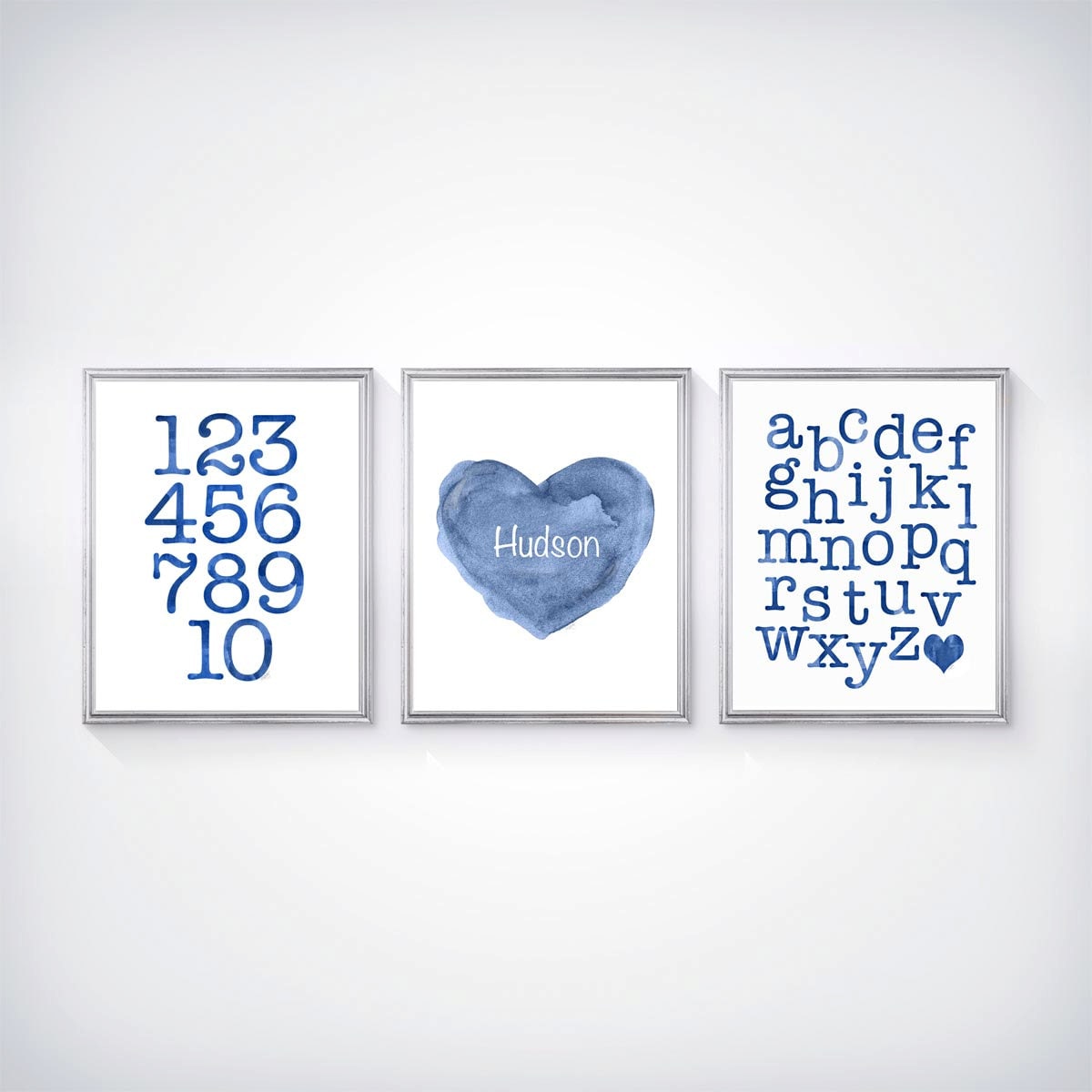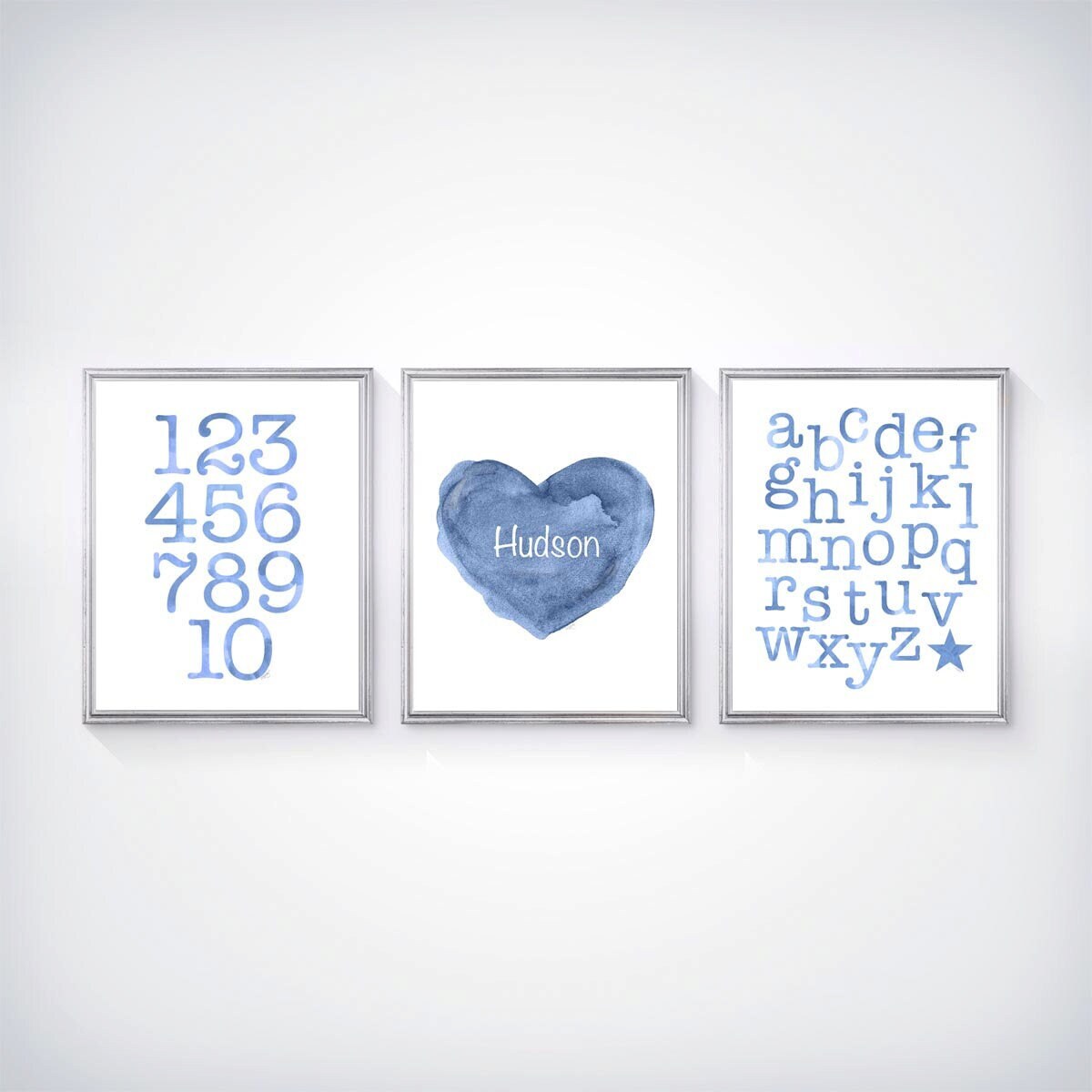 Personalize my denim blue heart with your boy's name. Coordinating ABC 123 Prints are available in pale blue or navy blue. A set of 3 watercolor prints recreated from my original watercolor paintings. A sweet way to learn! Just leave the name in the 'notes to seller' at checkout. Also, note the ABC print is available with a heart or a star in the lower right corner.