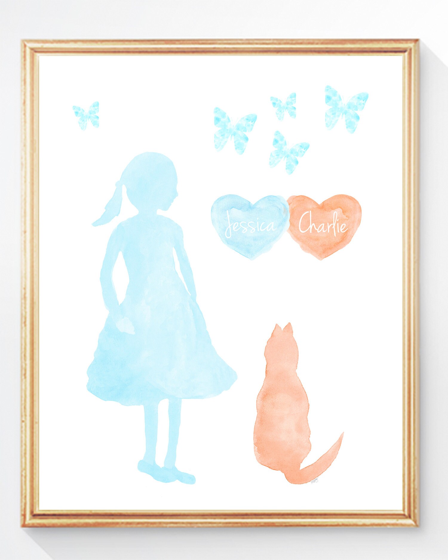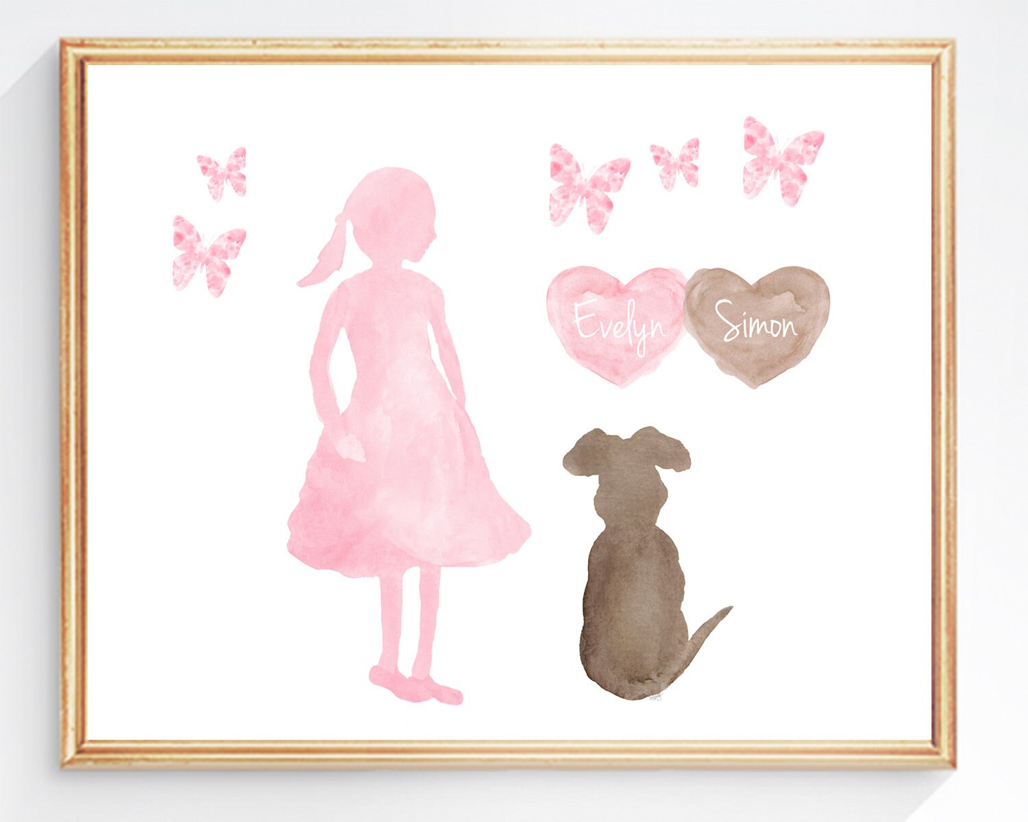 A sweet 8x10 art print celebrate's a little girls beloved companion. This print is recreated from my original watercolor paintings. You can customize the cat or dog color and the little girl color to match your decor using the chart in the pictures