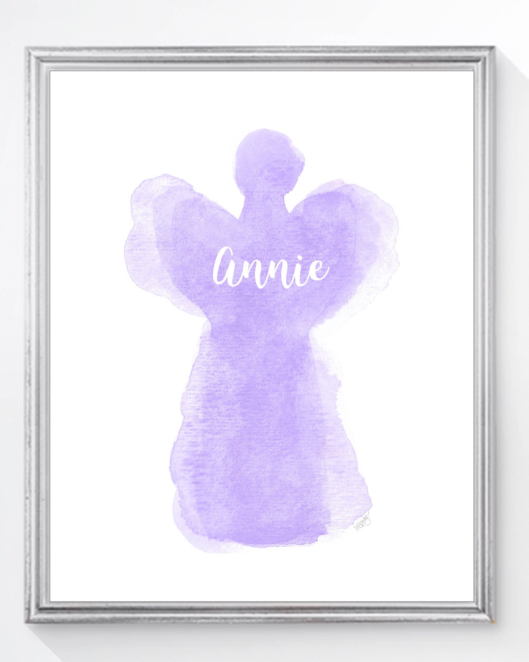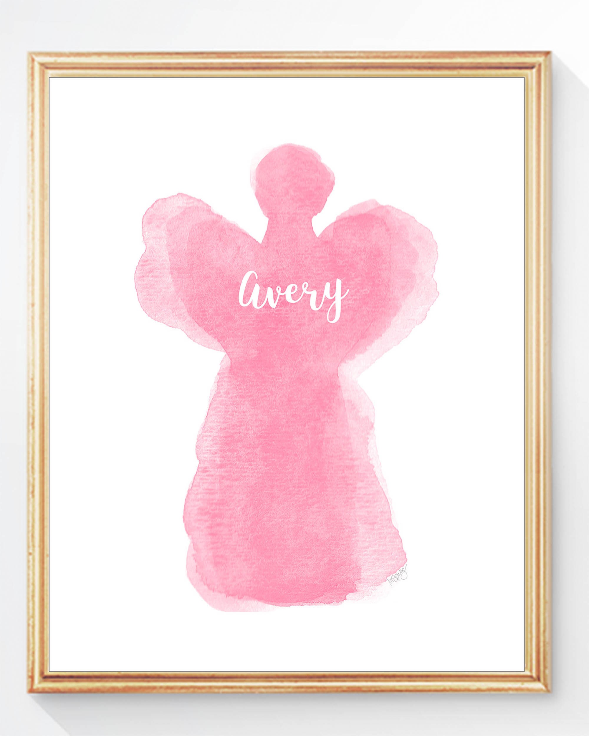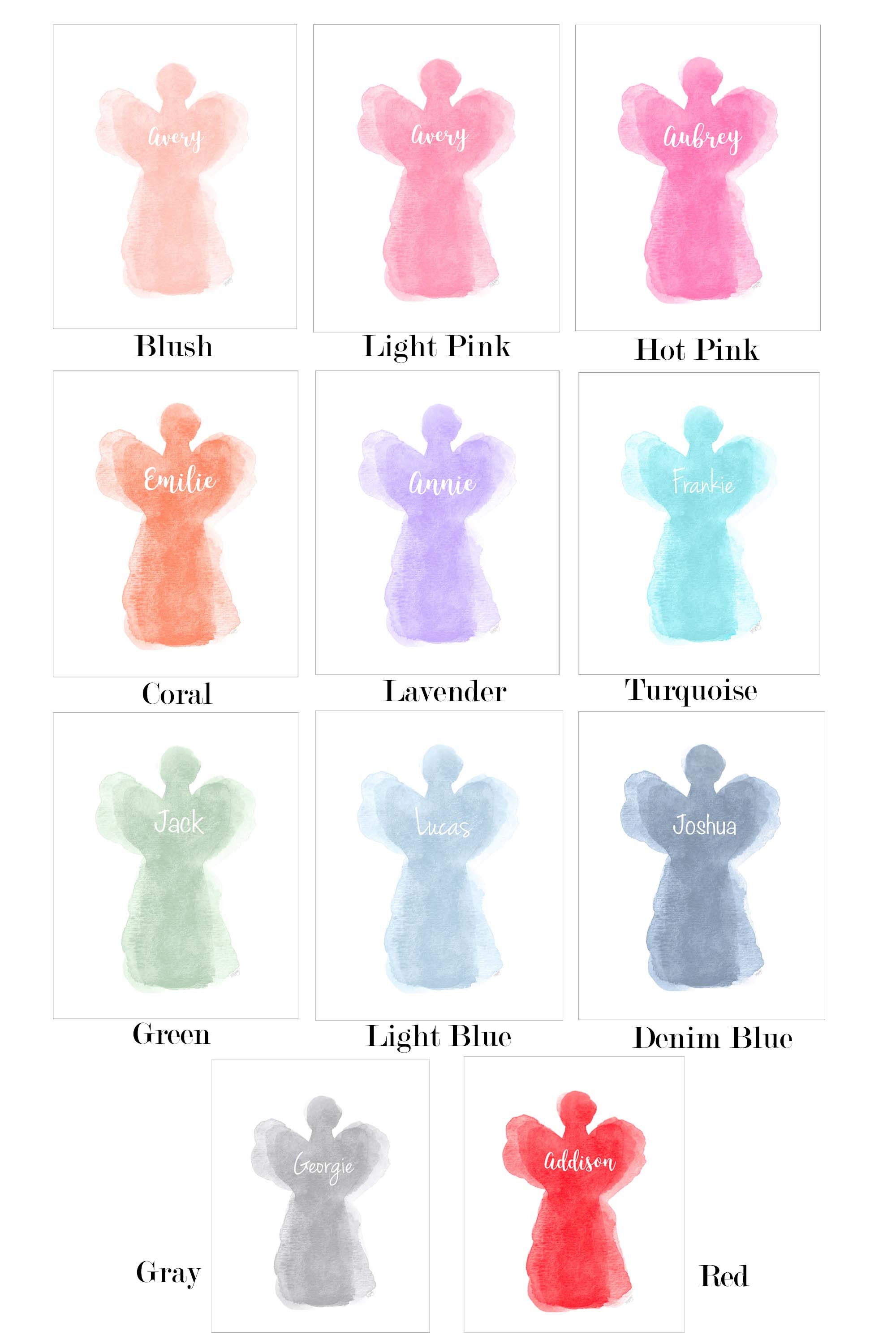 Customized my angel watercolor with your very special name. A 5x7 or 8x10 art print created from my original watercolor painting. Available in 11 colors.