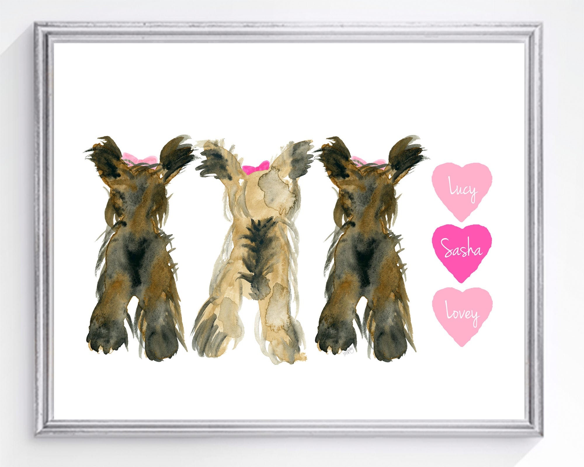 A sweet art print to commemorate or celebrate a beloved Yorkie family. This print is recreated from my original watercolor paintings. Please add the relevant info when you check out in the notes to seller section for each position. For the pink bows and hearts please note light pink or hot pink.