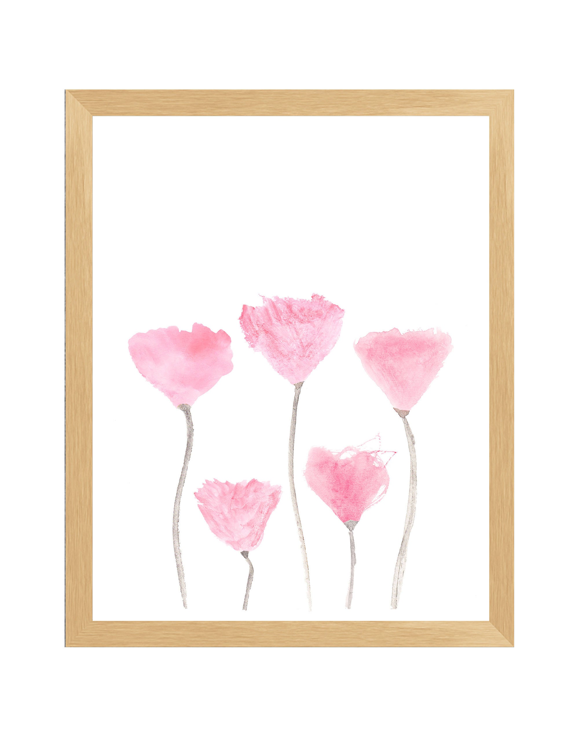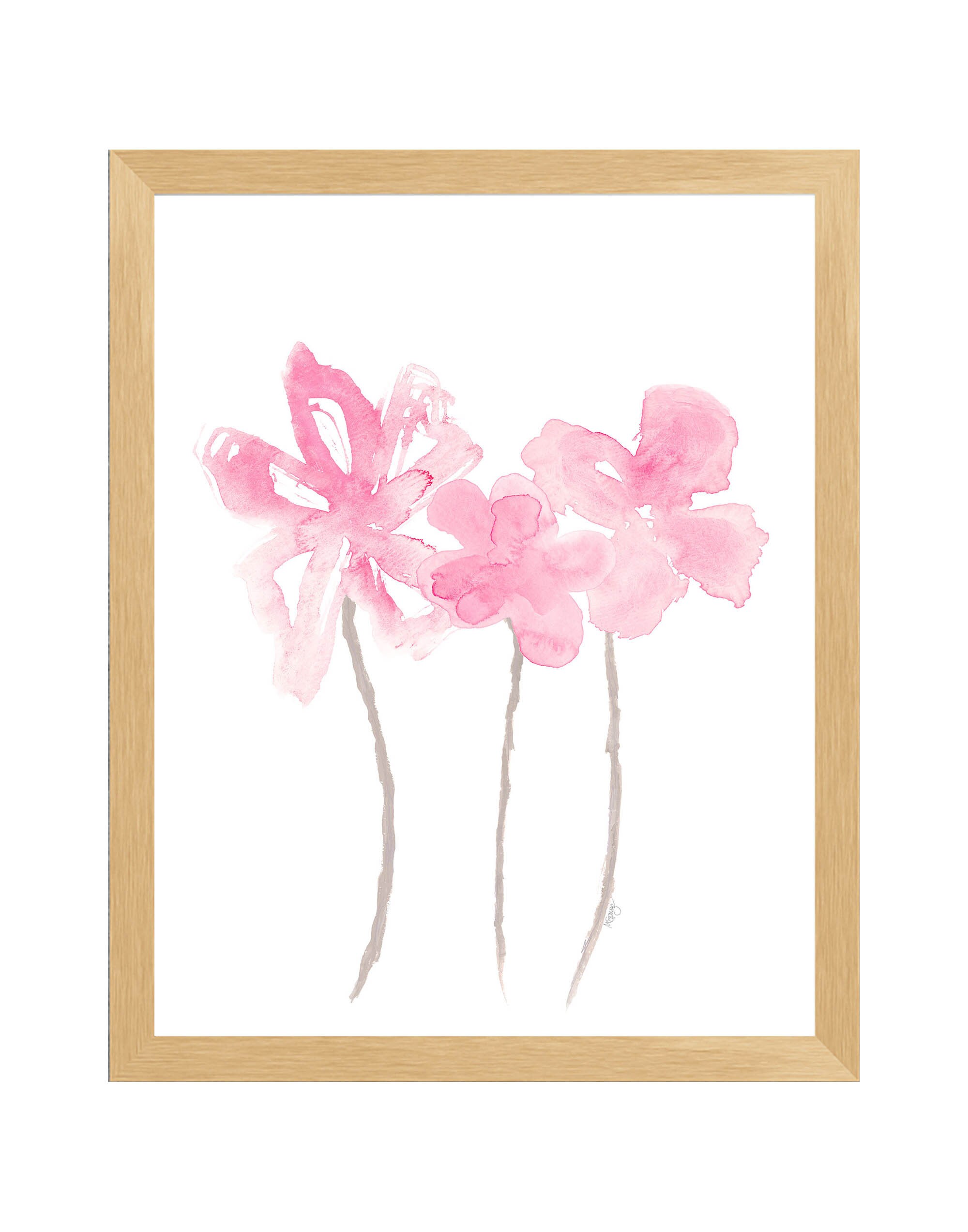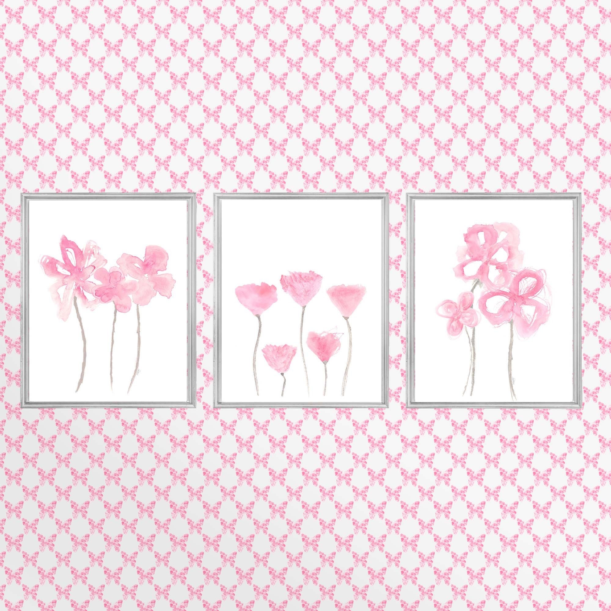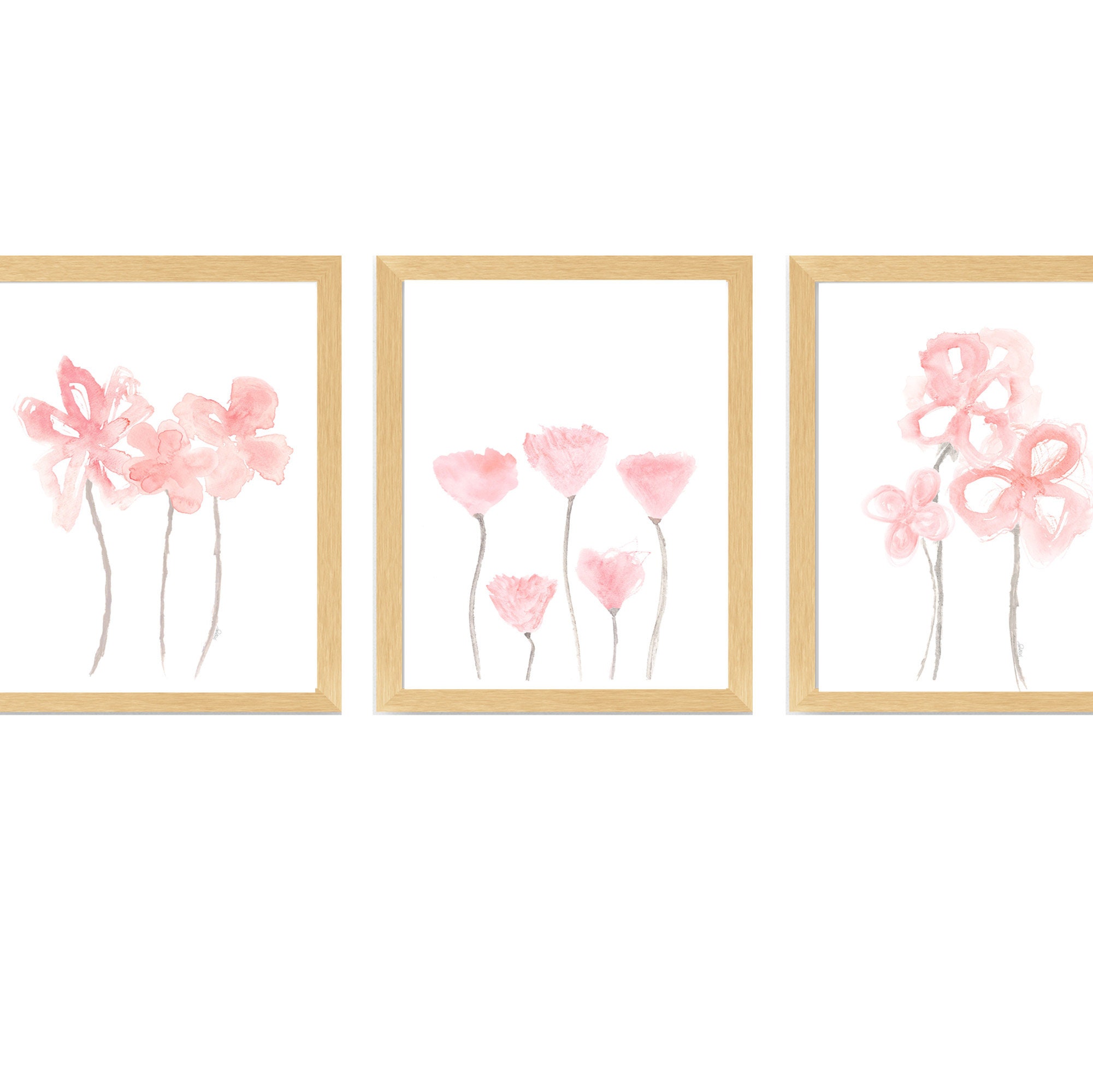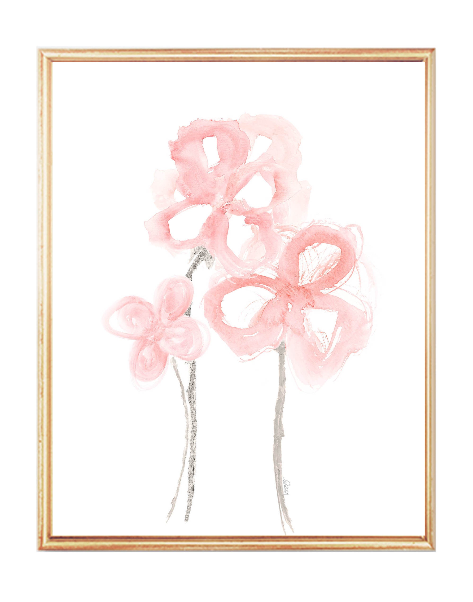 A ethereal set of three painterly coordinating flowers happily hanging together. Available in pink or blush, with stems in natural or gray. Blush is a pale coraly pink tint. This line up would work great in a girls room of any age. Each print is recreated from my original watercolor paintings.