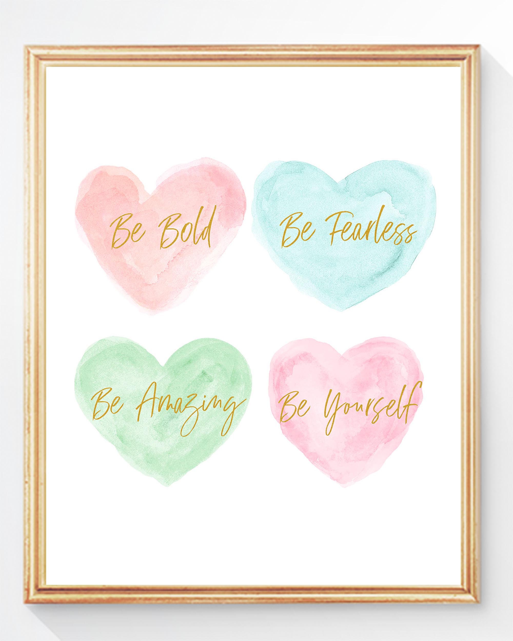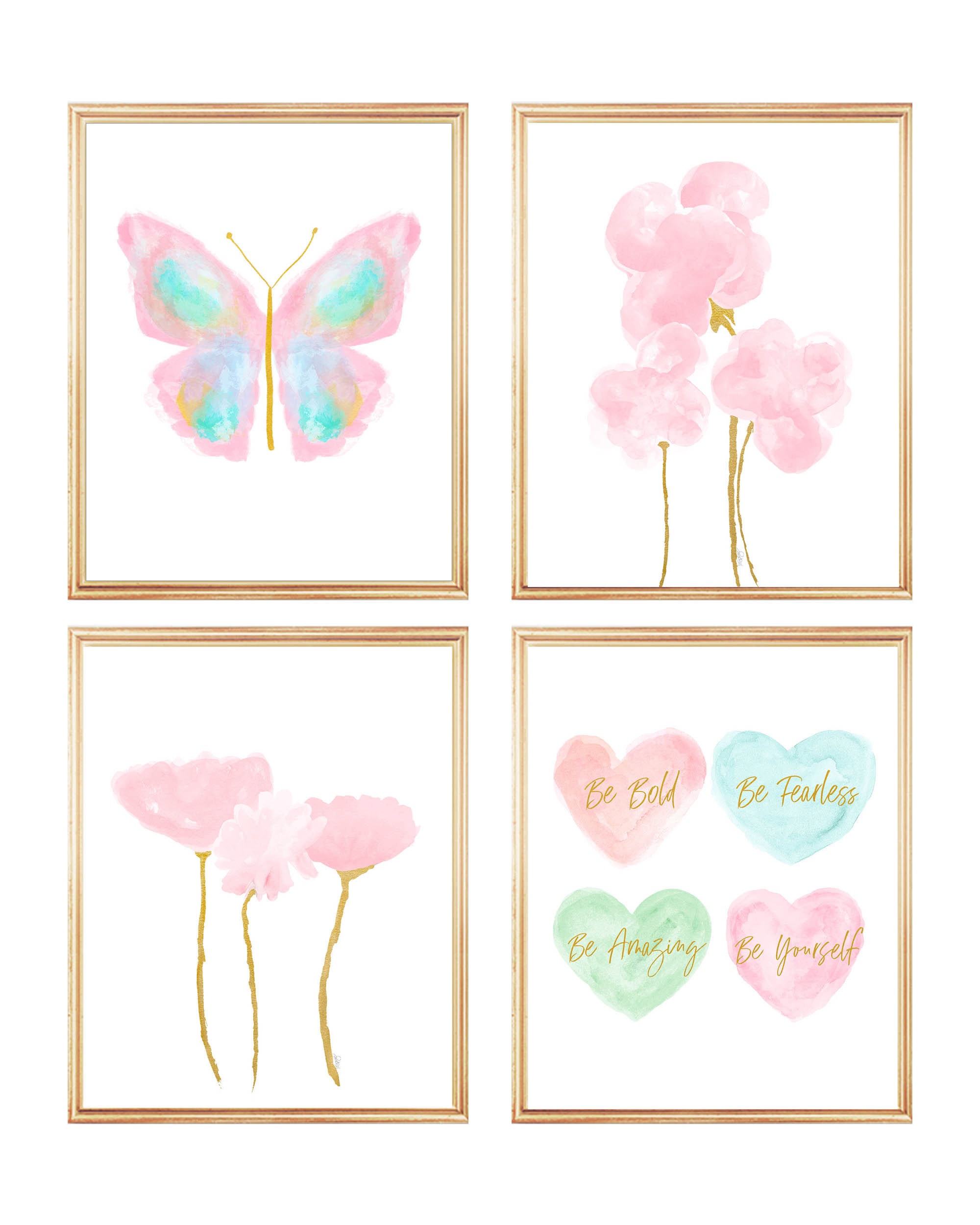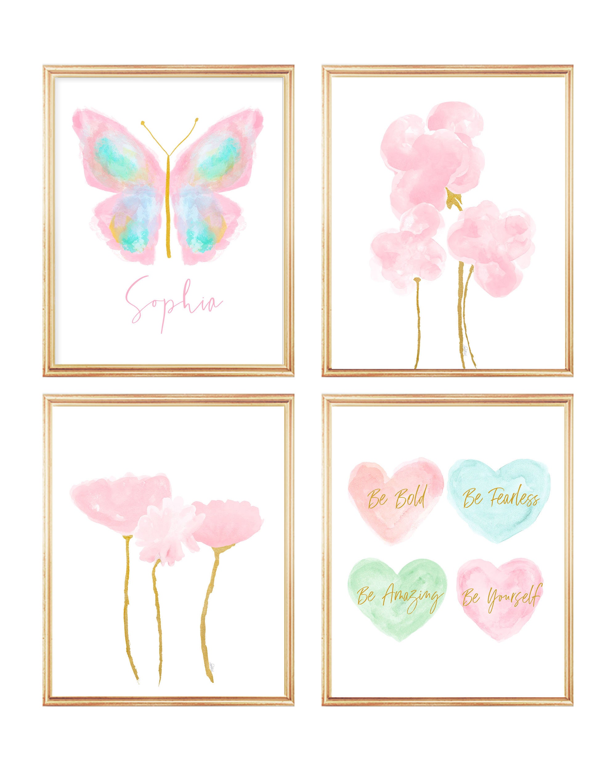 This pretty pastel collection is ready to hang in your sophisticated space. The painterly butterfly has a delicate gold body and is centered by a a pair of pink floral bouquets with gold stems Personalize the butterfly print in a modern script in pink or seafoam green, or leave blank. The inspirational hearts conveys uplifting and positive messages for your special girl. Each print is recreated from my original paintings. A set of four prints.
