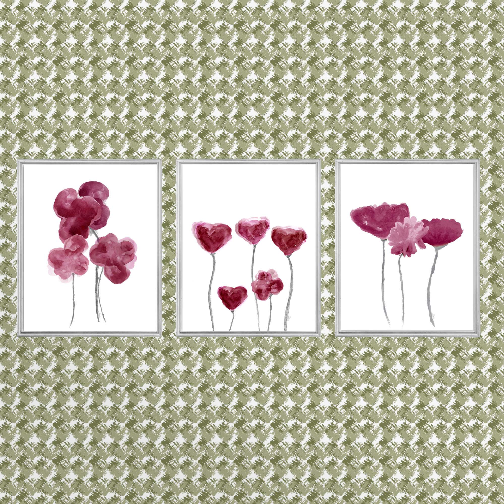 A sophisticated collection of denim blue and navy tinted flowers with sage green stems perfect for many types of spaces. A set of 3 art prints recreated from my original watercolor paintings.